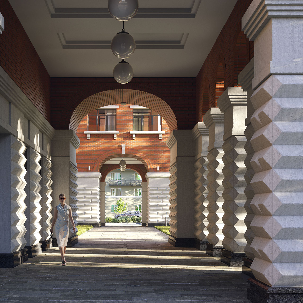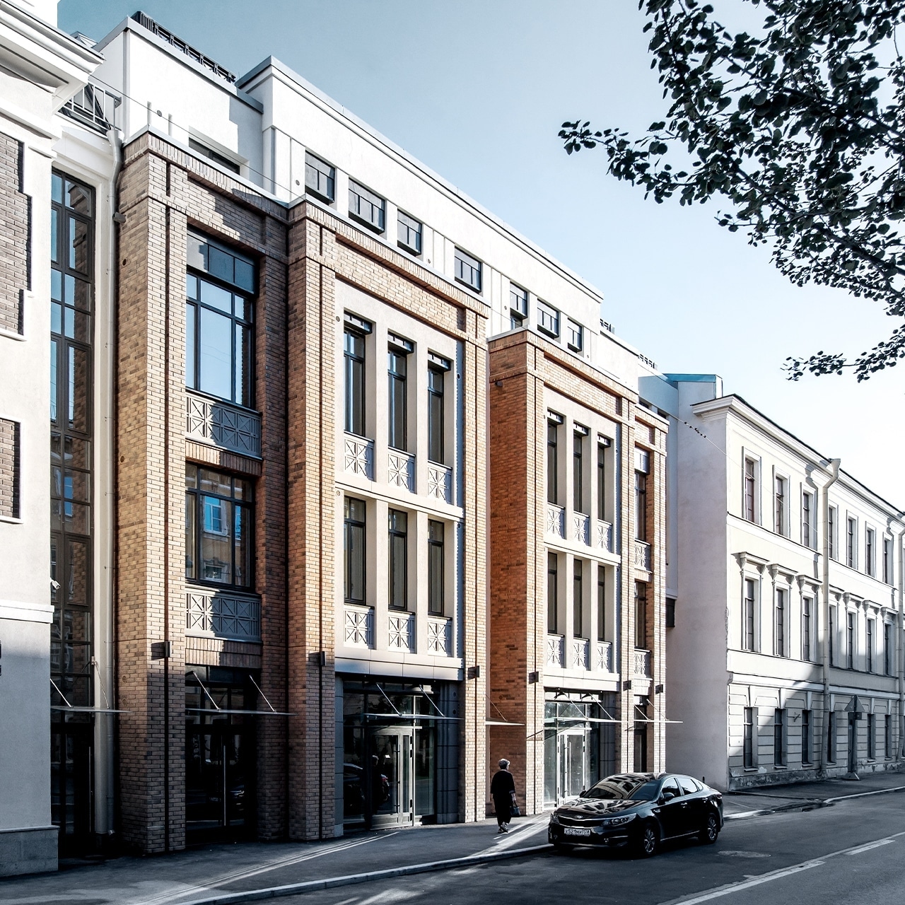 Архитектурная композиция перекликается с обликом памятников кирпичной архитектуры Петербурга конца XIX — начала XX веков.